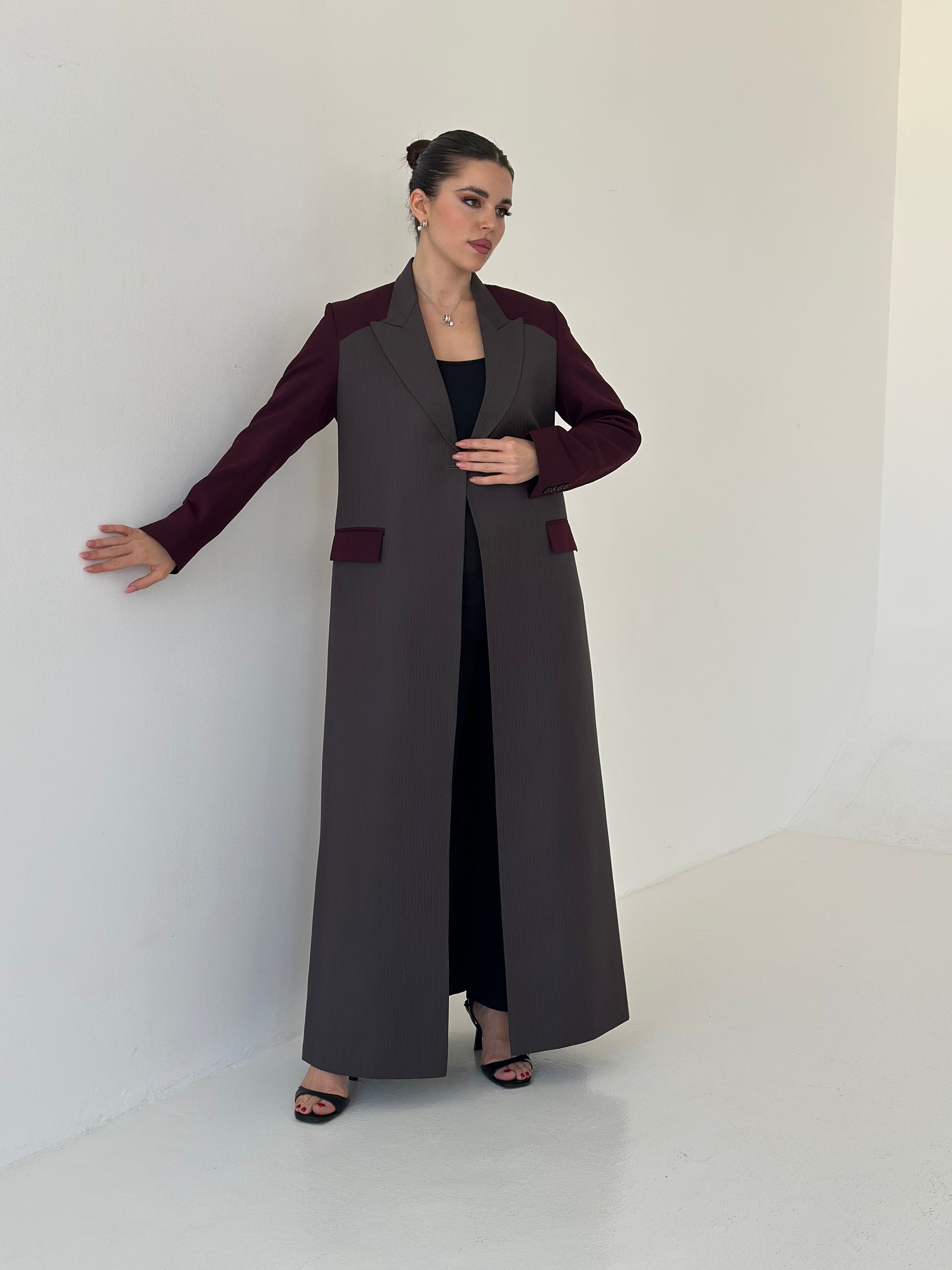- بليزر من قماش كريب فاخر رمادي مقلم.