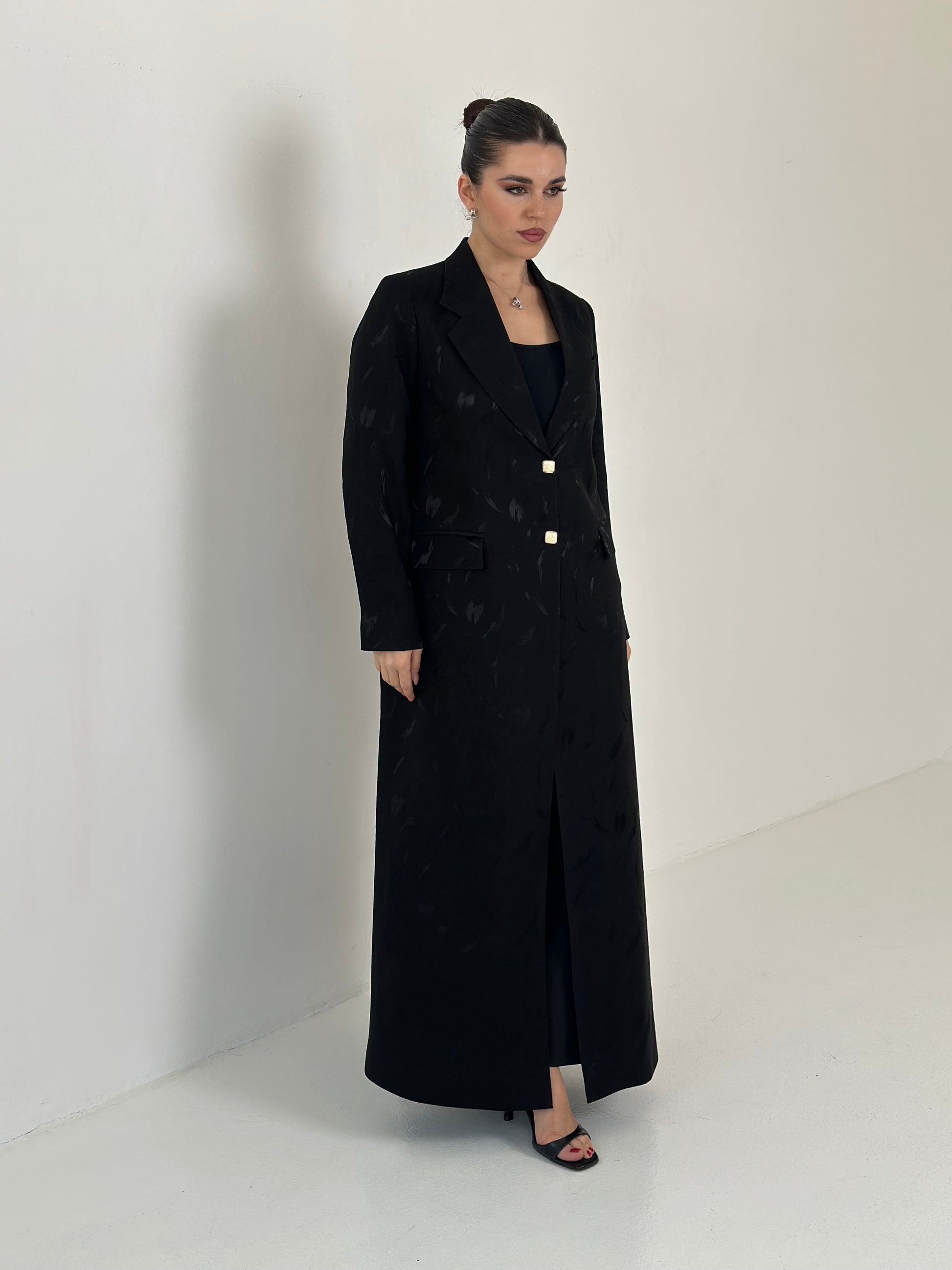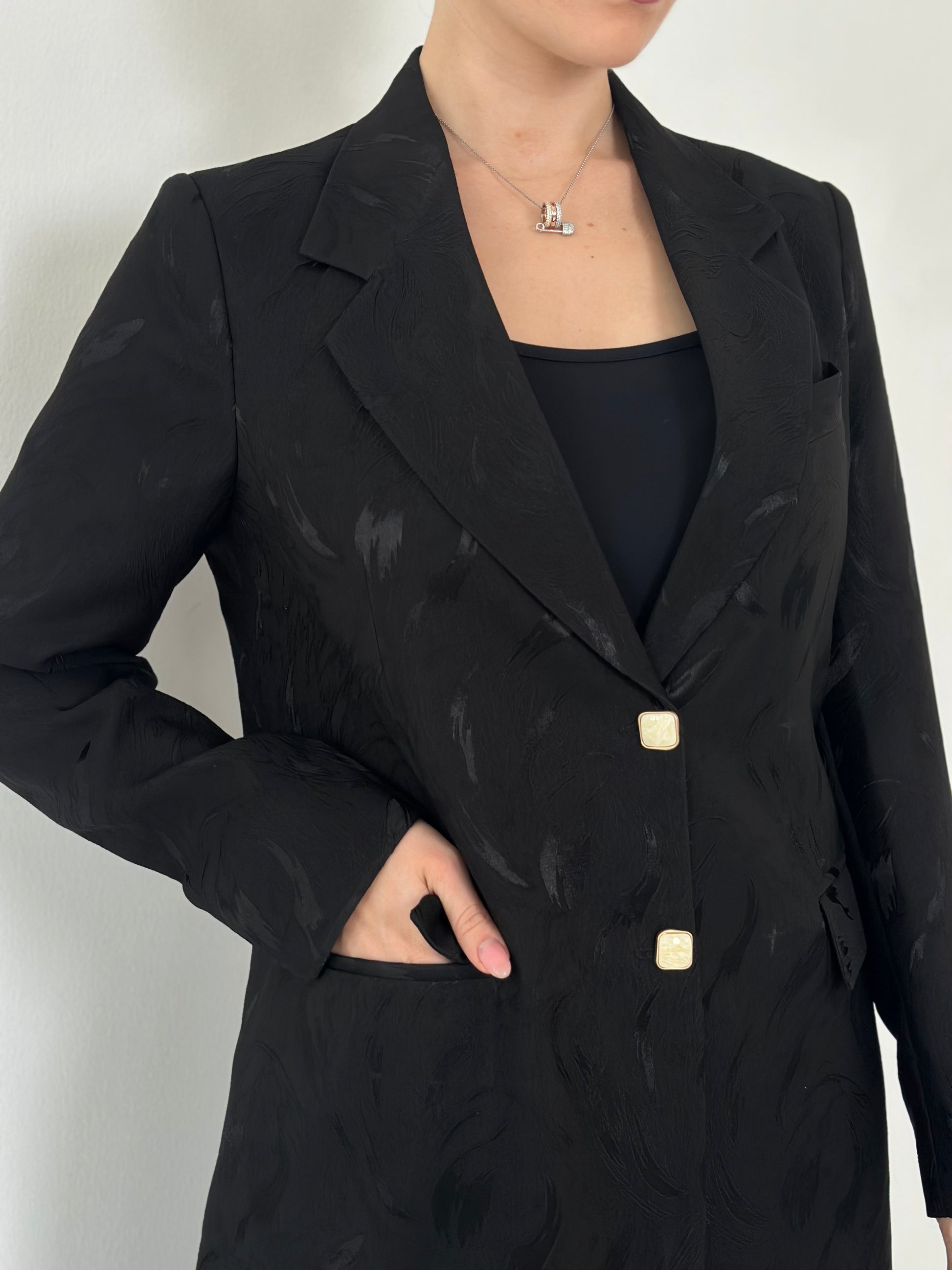 - بليزر أسود من قماش الجاكارد الفاخر.